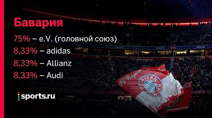 «Бавария» тоже добавила свою первую команду в отдельную структуру FC Bayern München AG, но плюсом к этому одобрила еще три компании в качестве инвест-поддержки – Allianz, Audi и Adidas. У каждой из них по 8,33% акций (стоимость такого пакета – порядка 100 миллионов евро), остальные 75,01%  принадлежат Большой «Баварии» – Fußball-Club Bayern München e.V., так соблюдается правило 50+1. Стать стратегическим партнером мюнхенцев дано не всем. Три указанных выше концерна – близкие друзья, поэтому их с удовольствием приняли в семью. Чужим, пусть и очень богатым, тут не рады.