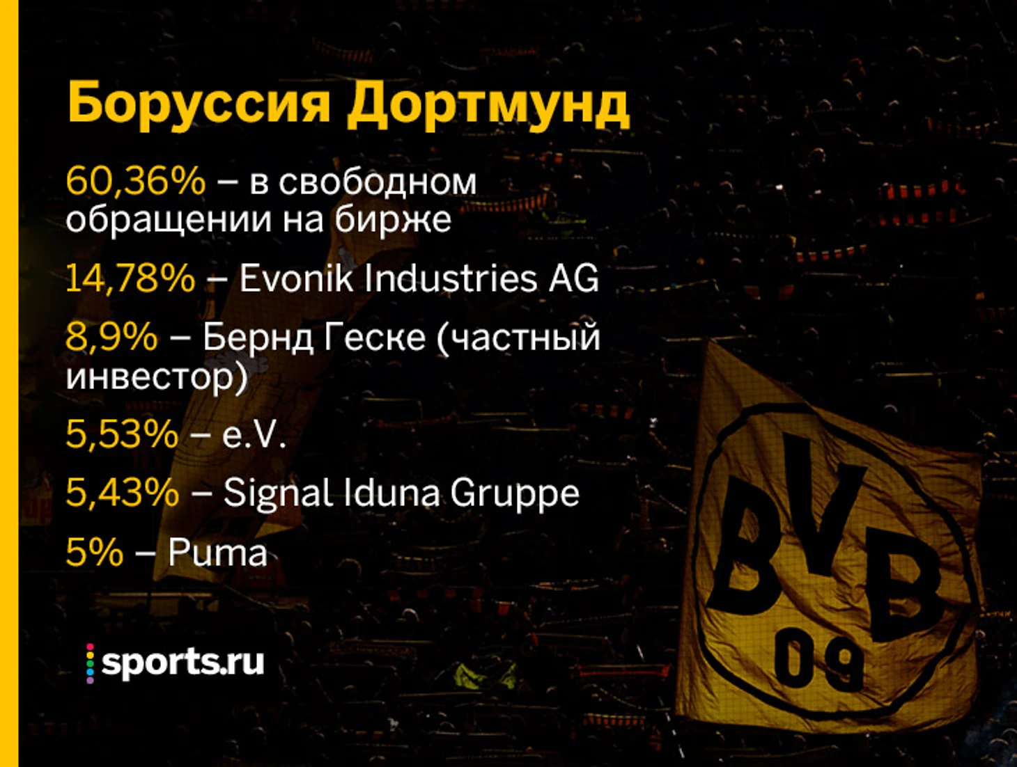 «Боруссия Дортмунд» – вернее, Ballspielverein Borussia 09 e.V. Dortmund – владеет всего 5,53% акций выделенной в отдельное юридическое лицо фирмы Borussia Dortmund GmbH&Co. KGaA. Это еще одна форма управления – акционерно-коммандитное товарищество. 60,36% акций принадлежат стороннему капиталу и обращаются на фондовой бирже. Но так как в совете директоров большинство голосов принадлежит непосредственно клубу, претензий к «Дортмунду» нет.
