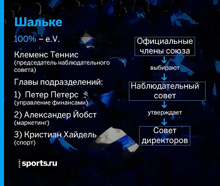 «Шальке» – один из последних клубов высшей лиги, который отказывается меняться и вот уже на протяжении 114 лет остается e.V., из-за чего не может привлекать инвесторов (зато умеет находить щедрых друзей, которым не жалко 20 млн евро в год на размещение названия их бренда на футболках «Гельзенкирхена»), задыхается от количества контролирующих его жизнь наблюдательных и прочих советов и периодически тонет в разногласиях между членами клуба. Их у него набралось уже 150 000 человек (пятый показатель в мире среди спортивных сообществ), и у каждого свой взгляд на дальнейшую судьбу клуба, с которым нужно считаться.