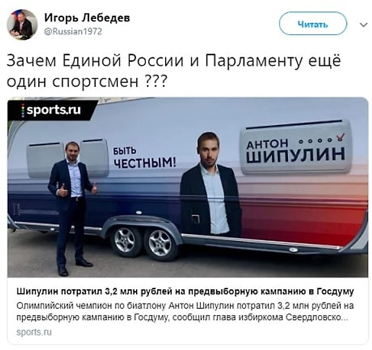 Депутат Госдумы России Игорь Лебедев прокомментировал информацию о том, что олимпийский чемпион по биатлону Антон Шипулин потратил 3,2 млн рублей на предвыборную кампанию.