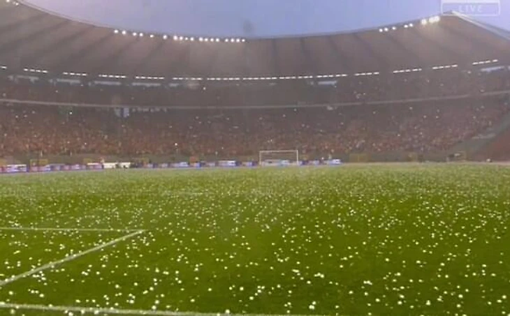 В результате команды покинули поле, а работники стадиона, где проходит матч, убрали град с газона.