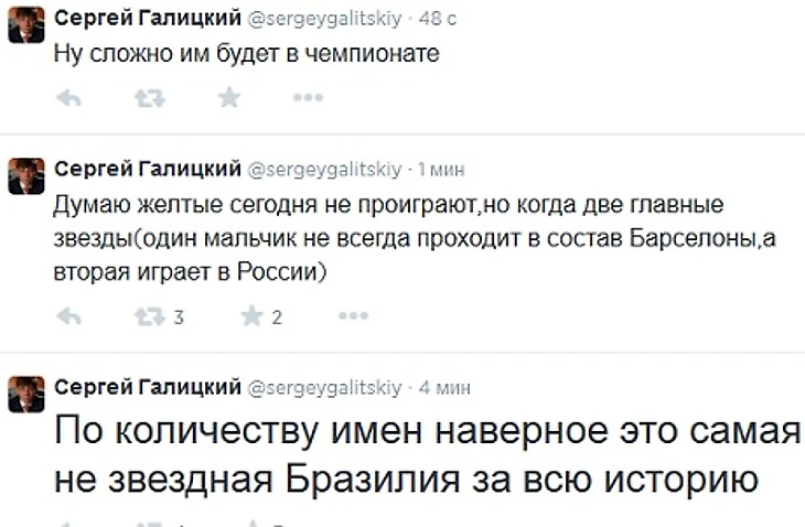 Думаю «желтые» сегодня не проиграют, но когда две главные звезды (один мальчик не всегда проходит в состав «Барселоны», а вторая играет в России – Неймар и Халк – прим. Sports.ru)… Ну, сложно им будет в чемпионате», – написал в своем твиттере Галицкий.