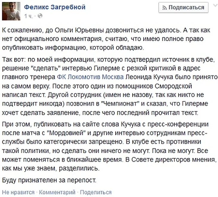 По моей информации, которую подтвердил источник в клубе, решение сделать интервью Гильерме с резкой критикой в адрес главного тренера «Локомотива» Леонида Кучука было принято на самом верху.