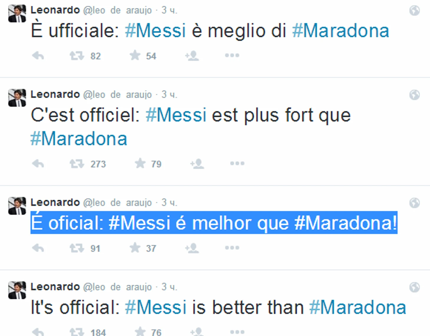 «Месси лучше Марадоны — это официально», — написал Леонардо твиттере.