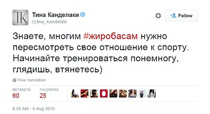 «Знаете, многим жиробасам нужно пересмотреть свое отношение к спорту. Начинайте тренироваться понемногу, глядишь, втянетесь», – написала Канделаки.