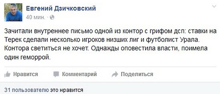 «Зачитали внутреннее письмо одной из контор с грифом «дсп»: ставки на «Терек» сделали несколько игроков низших лиг и футболист «Урала».