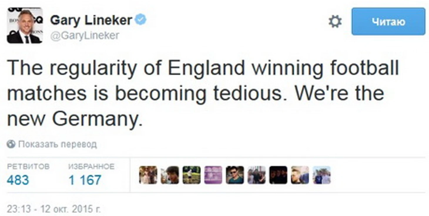 «Регулярные победы Англии уже становятся утомительными. Мы новая Германия», – написал Линекер в своем твиттере.