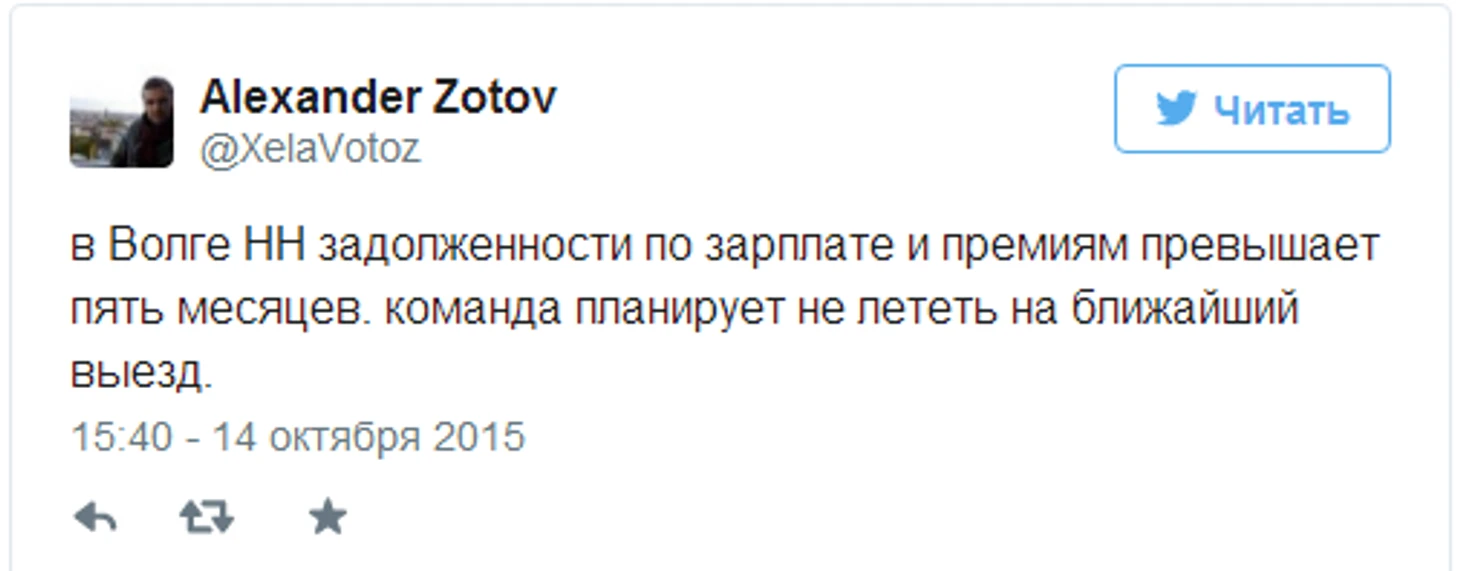 «В «Волге» НН задолженности по зарплате и премиям превышают пять месяцев. Команда планирует не лететь на ближайший выезд», – сообщил представитель Общероссийского профессионального союза футболистов Александр Зотов.