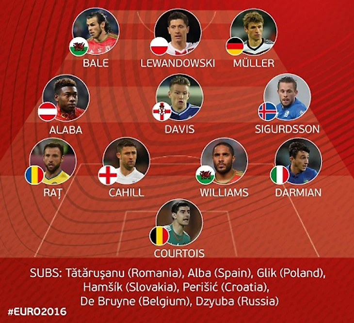 Основной состав: Тибо Куртуа (Бельгия), Рэзван Рац (Румыния), Гари Кэйхилл (Англия), Эшли Уильямс (Уэльс), Маттео Дармиан (Италия), Давид Алаба (Австрия), Стивен Дэвис (Северная Ирландия), Гильфи Сигурдссон (Исландия), Гарет Бэйл (Уэльс), Роберт Левандовски (Польша), Томас Мюллер (Германия).