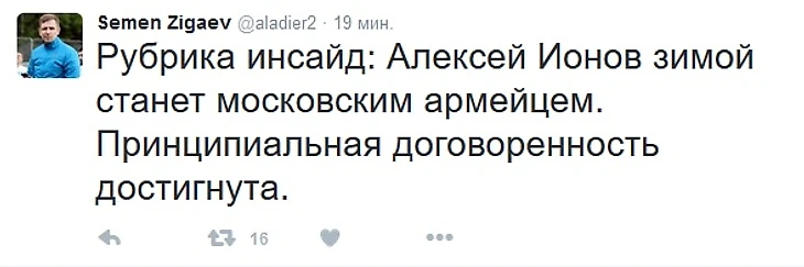 «Алексей Ионов зимой станет московским армейцем. Принципиальная договоренность достигнута», – написал Зигаев в твиттере.