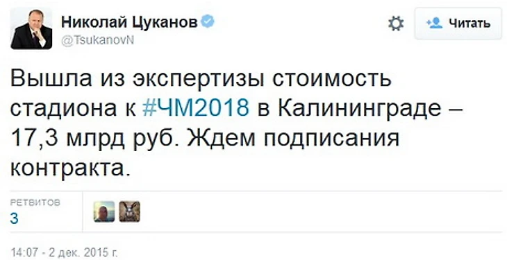 «Вышла из экспертизы стоимость стадиона к ЧМ-2018 в Калининграде – 17,3 миллиарда рублей. Ждем подписания контракта», – написал Цуканов в своем твиттере.