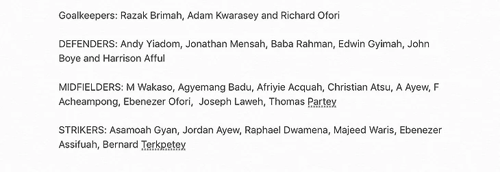 В число 26 игроков включен защитник «Анжи» Джонатан Менса. Не получили вызов Джеффри Шлупп («Лестер»), Квадво Асамоа («Ювентус»), Кевин-Принс Боатенг («Лас-Пальмас») и Салли Мунтари (без клуба).