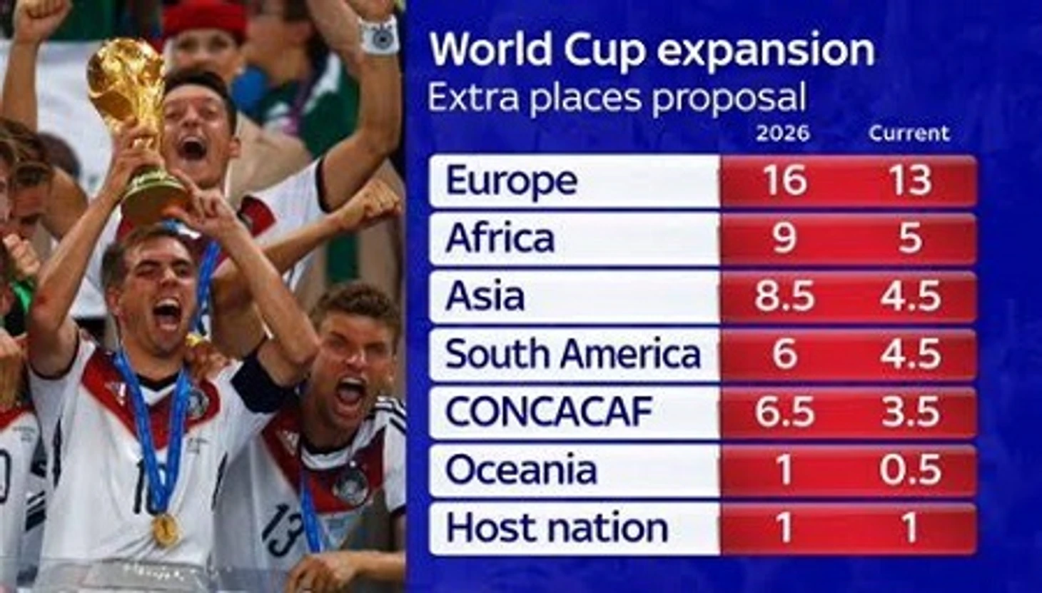 Европа, по версии телеканала, увеличит свою квоту с 13 команд до 16, Африка – с 5 до 9, а Южная Америка с 4,5 (4 сборные сейчас попадают в финальную часть турнира напрямую, еще одна – через стыковые матчи) до 6.