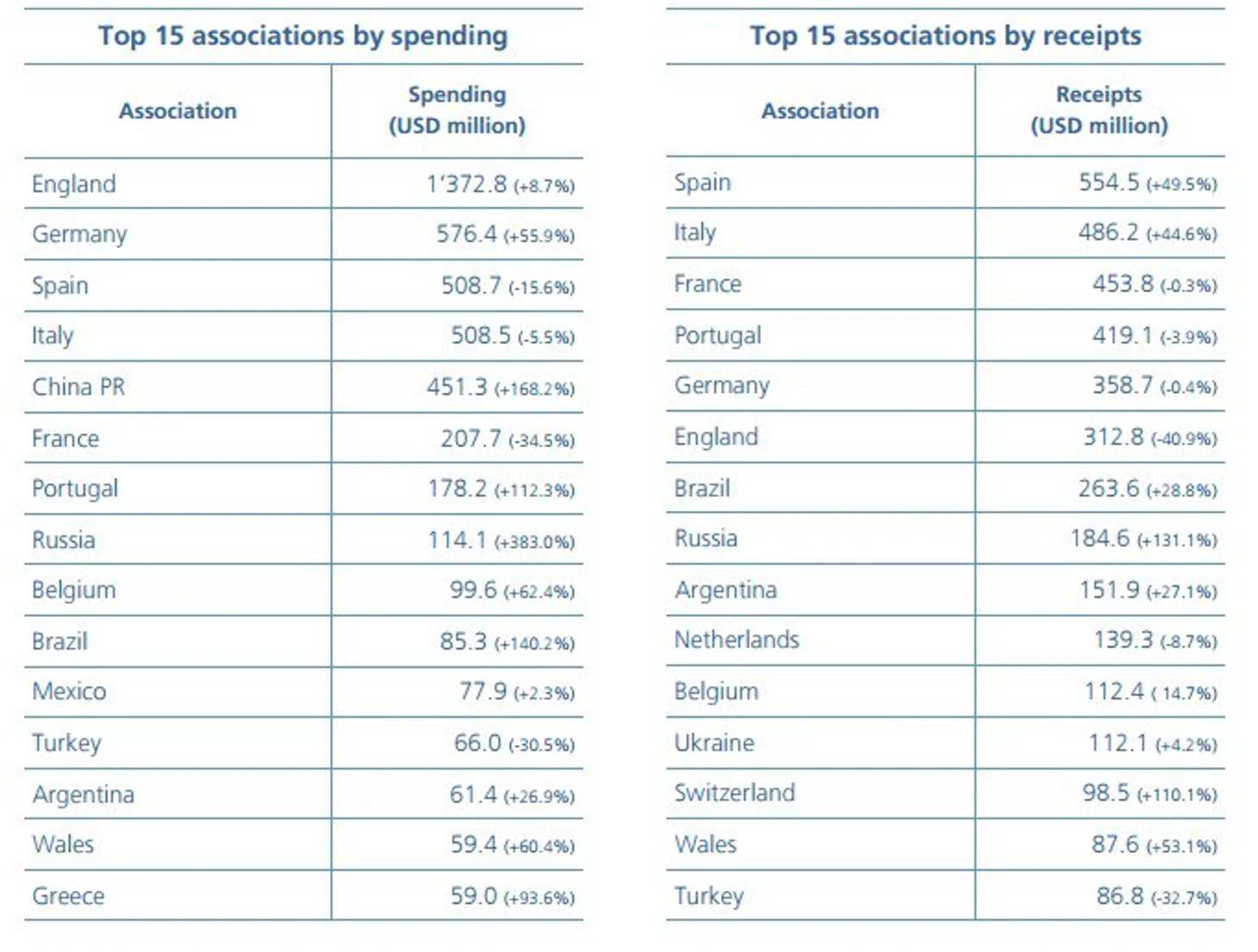 Лидером списка с большим отрывом является Англия, где клубы потратили на трансферы 1,372 миллиарда долларов. Следом идут Германия (576,4 млн) и Испания (508,7 млн).