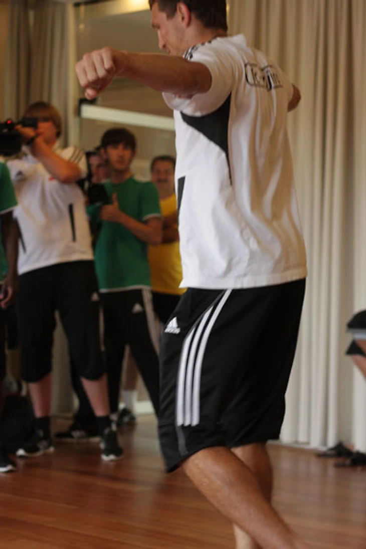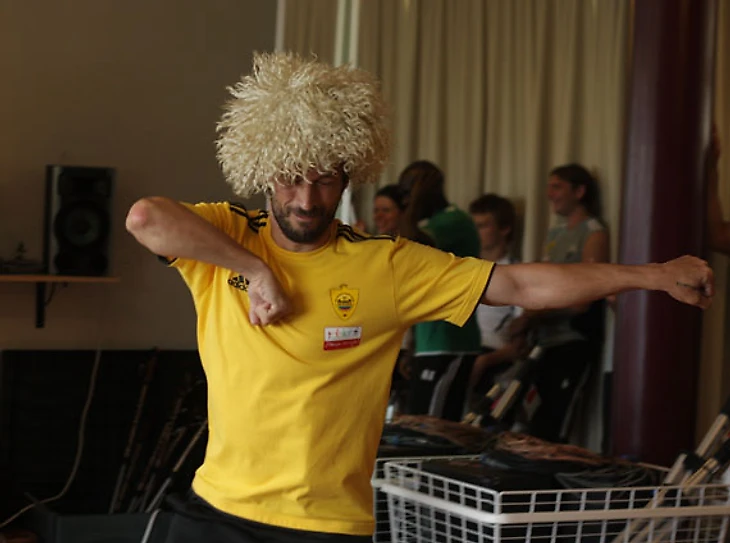 – В новой истории у нас еще не появилась своя фишка для празднования гола. Нам нужен коронный номер. И сегодня нам предложат три варианта танцевальных па, – тренер Арсен Акаев сразу объясняет, зачем здесь собрали команду. Танцор Мухамеднур Султанов сразу предлагает игрокам отпраздновать гол.