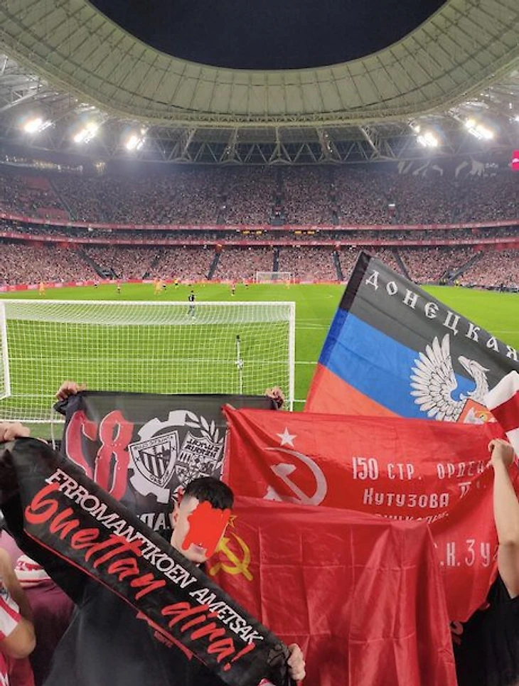 В частности, на фотографиях, распространившихся в соцсетях, видно, что на трибуне фанатов баскского клуба были флаги с советской символикой, а также флаг ДНР.