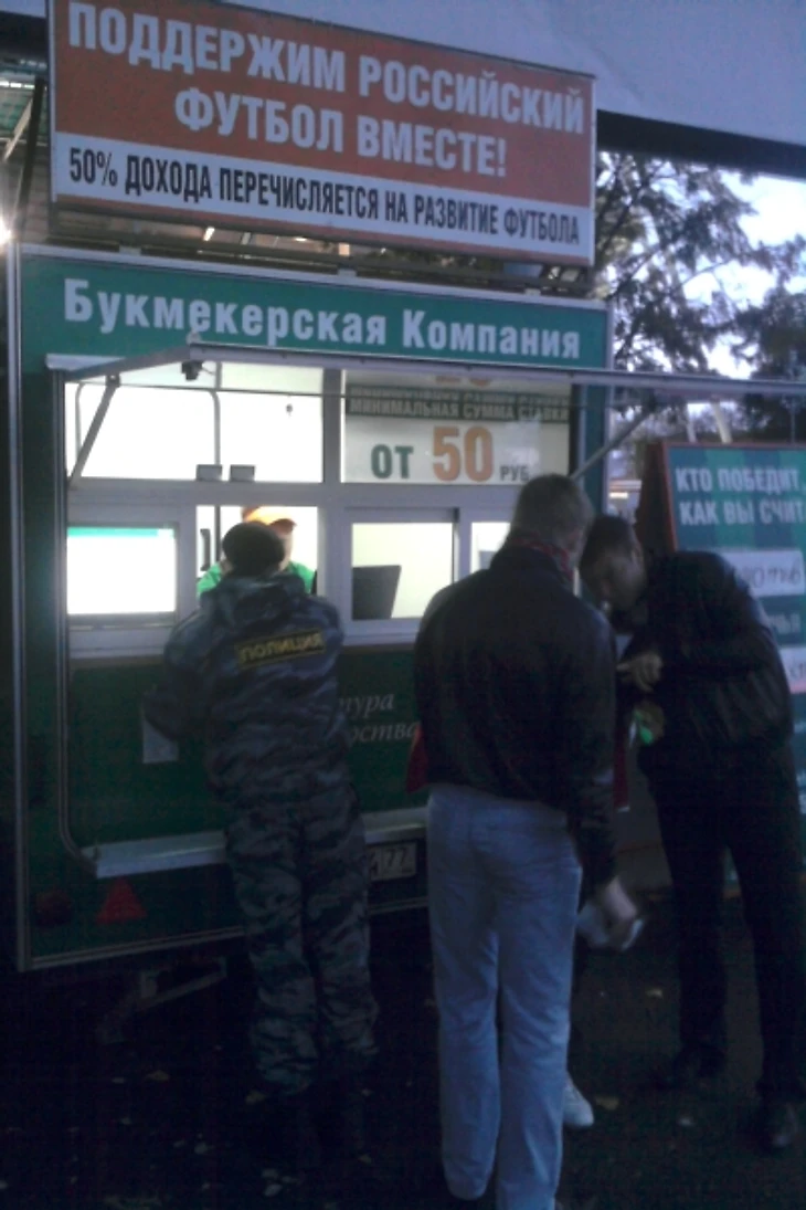 У дежурившего на территории стадиона полицейского проблем с совестью не возникло. Оставив свой пост, он направился к букмекерским палаткам, из четырех категорий выбрал ту, что попроще – с минимальной ставкой в 50 рублей – достал из заднего кармана аккуратно сложенный листок и принялся надиктовывать здоровенный «экспресс», быстро скопив позади себя очередь.