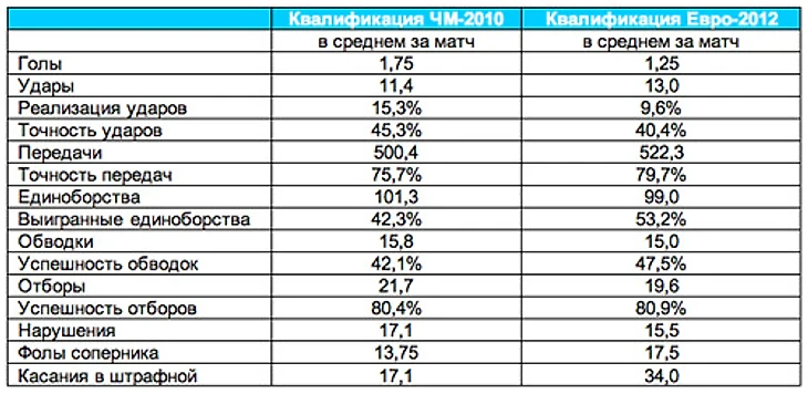 Одно из отличий сборной Адвоката от сборной Хиддинка в том, что она старается больше контролировать мяч. Средний процент владения мячом в матчах отбора Евро-2012 у России равен 61.2% – это десятый показатель среди всех команд (больше, например, чем у Англии и Турции); кроме того, эти цифры чуть выше, чем в квалификации ЧМ-2010 (58.7%) – хотя там, вроде бы, наша сборная расправлялась с соперниками куда увереннее. Даже в выездных играх с Ирландией и Арменией Россия владела мячом больше 60% времени. Команда Адвоката в среднем фолит реже, чем команда Хиддинка, чаще зарабатывает штрафные в свою пользу, чуть реже вступает в единоборства и чаще их выигрывает – собственно, контроль мяча и подразумевает ровно такую динамику статистических показателей.