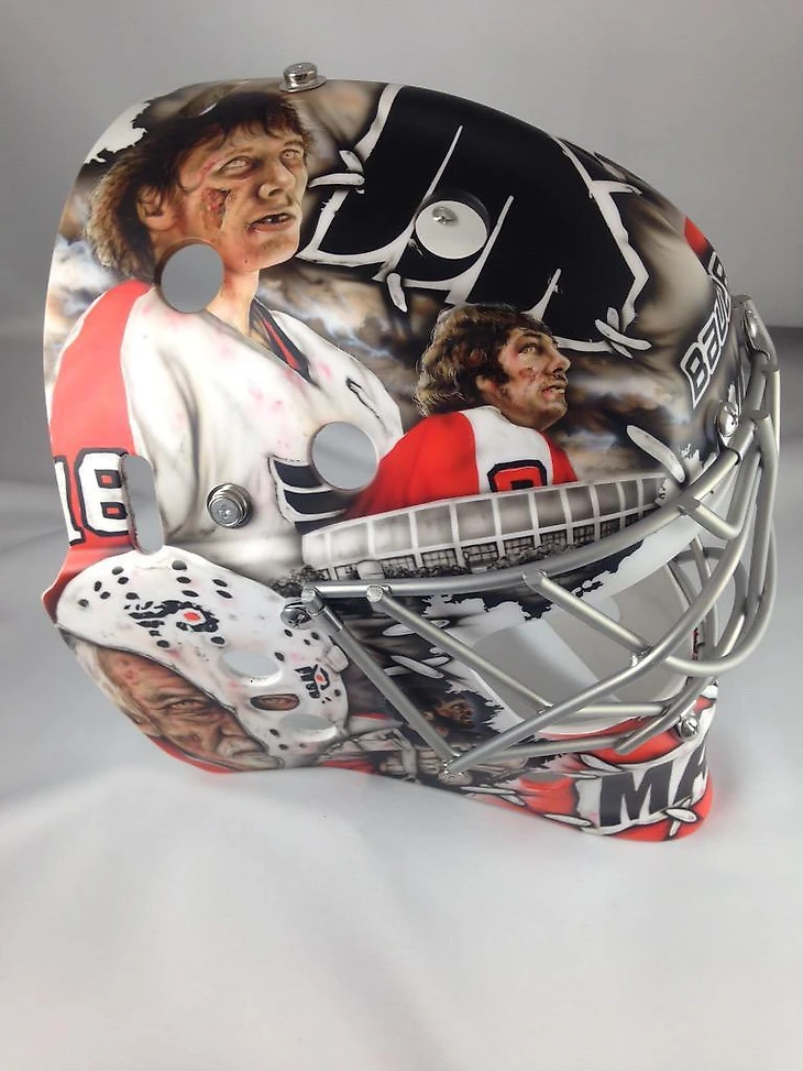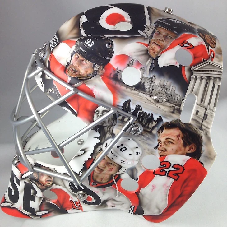 Маска расписана студией Paint Zoo и украшена традиционными цветами «Флайерс». С левой части на шлеме канадца изображены его нынешние одноклубники: Клод Жиру, Якуб Ворачек, Люк и Брэйден Шенны, Уэйн Симмондс и Майкл Дель Зотто. Справа на шлеме присутствуют легенды клуба — Бобби Кларк, Берни Парент, Дэйв Шульц и Рон Хэкстолл.