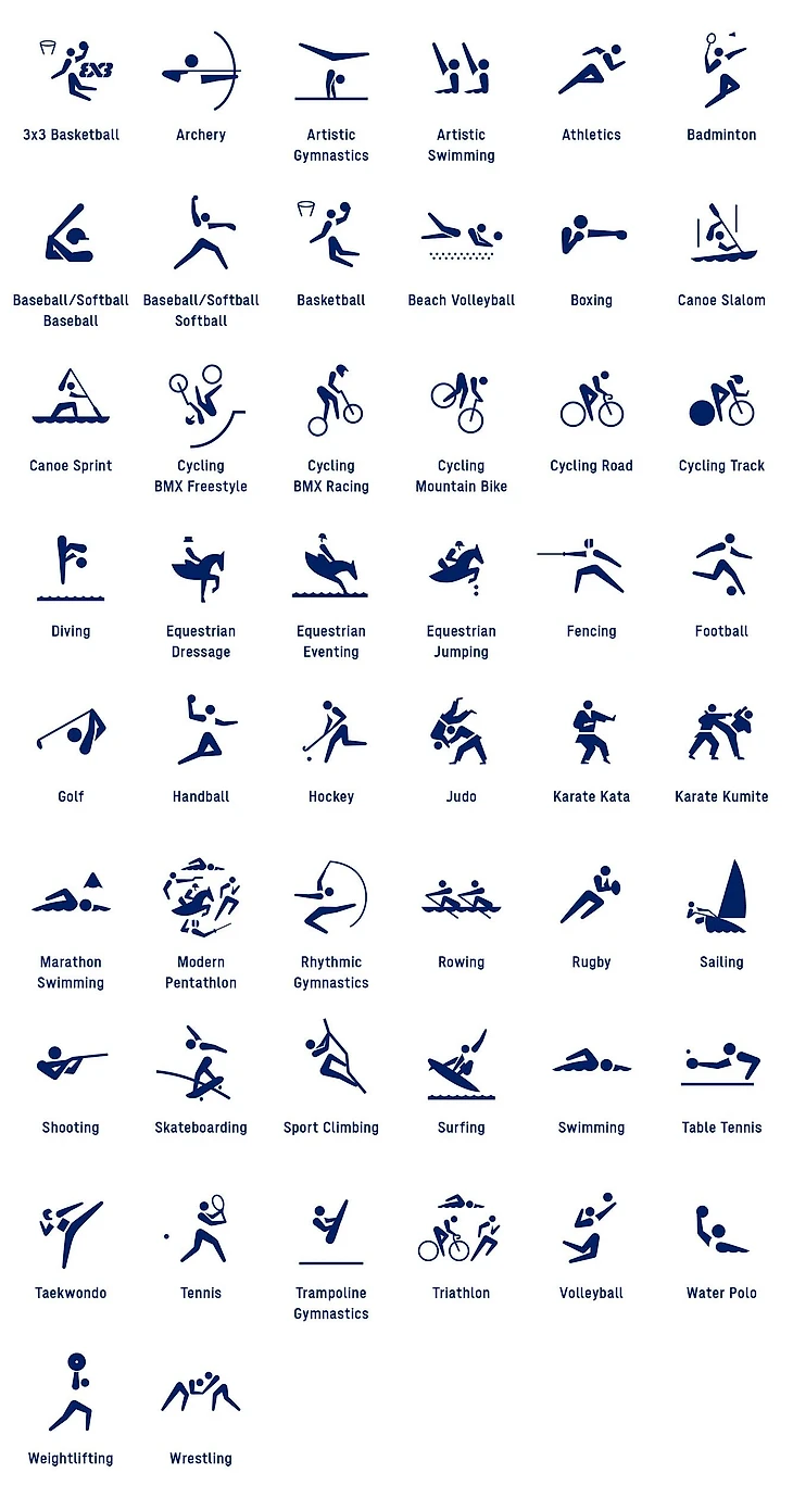 Примечательно, что некоторые виды спорта имеют несколько пиктограмм, поскольку имеют различные дисциплины.