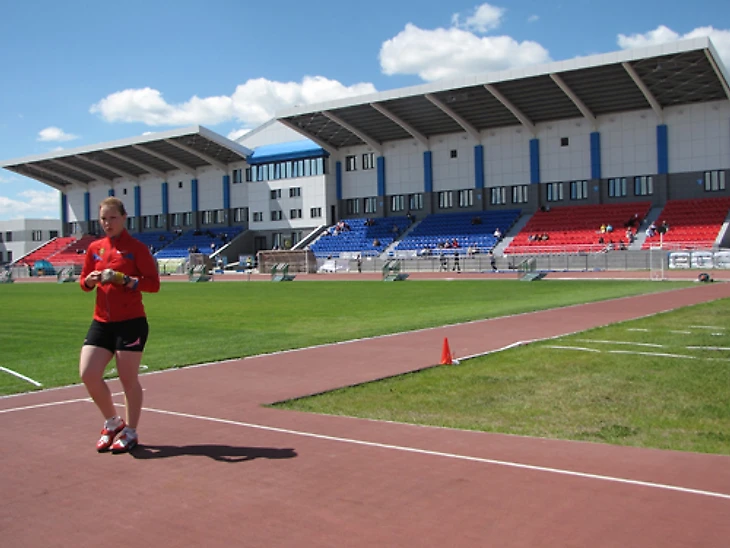 Мы в Ерино, это совсем рядом с Подольском. Тут построили новый комплекс – и он больше предназначен для легкой атлетики, чем для футбола, хотя на здешнем поле и играет команда второй лиги. Дорожки тут идеальные.
