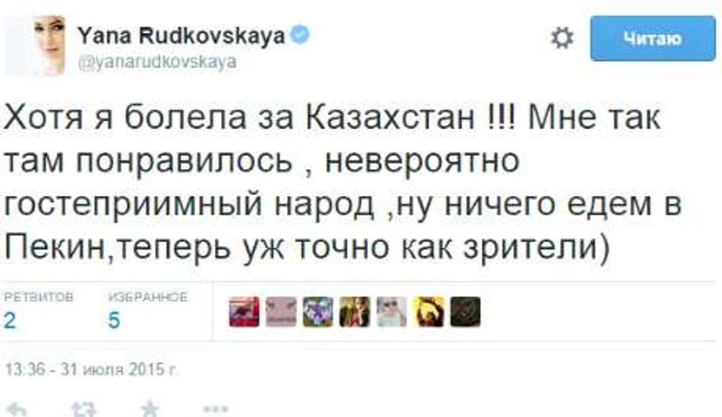 «Я болела за Казахстан! Мне так там понравилось, невероятно гостеприимный народ. Ну ничего, едем в Пекин, теперь уж точно как зрители», – написала Рудковская.