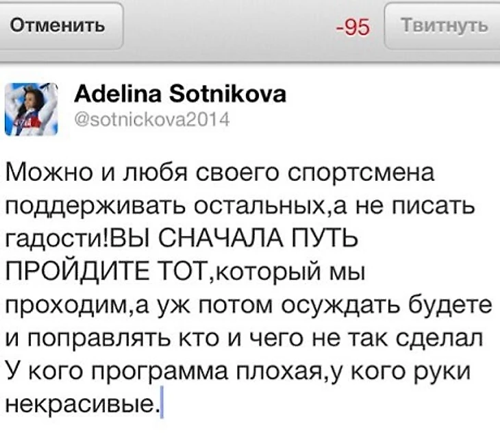 Вы сначала путь пройдите тот, который мы проходим, а уж потом осуждать будете и поправлять, кто и чего не так сделал, у кого программа плохая, у кого руки некрасивые», – написала Сотникова в своем твиттере.