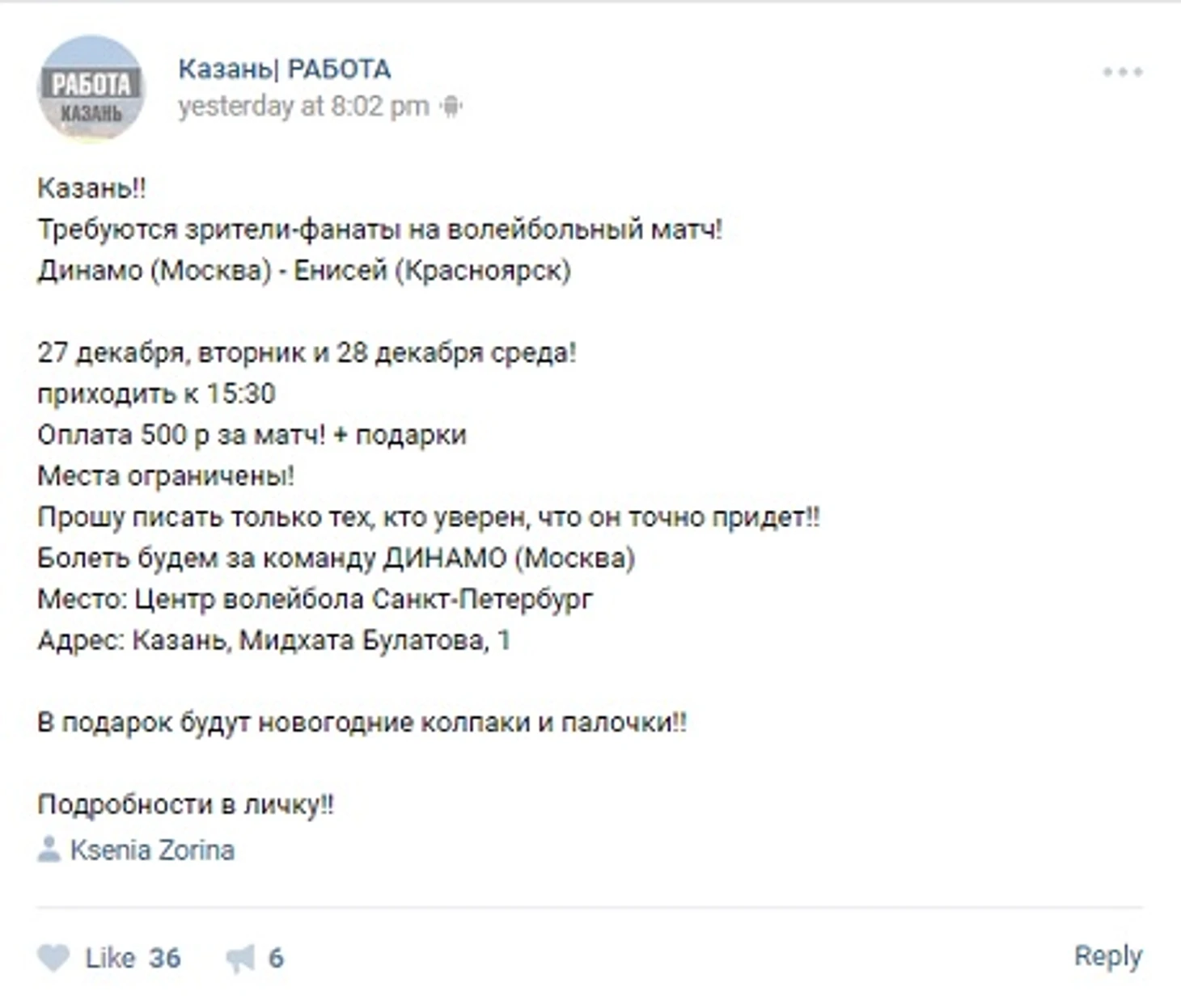 «Требуются зрители-фанаты на волейбольный матч! «Динамо» (Москва) – «Енисей» (Красноярск). Оплата 500 рублей за матч + подарки. Места ограничены! Болеть будем за команду «Динамо» (Москва). В подарок будут новогодние колпаки и палочки», – говорится в сообщении.