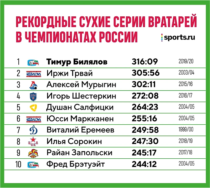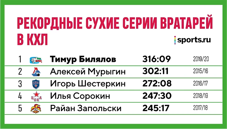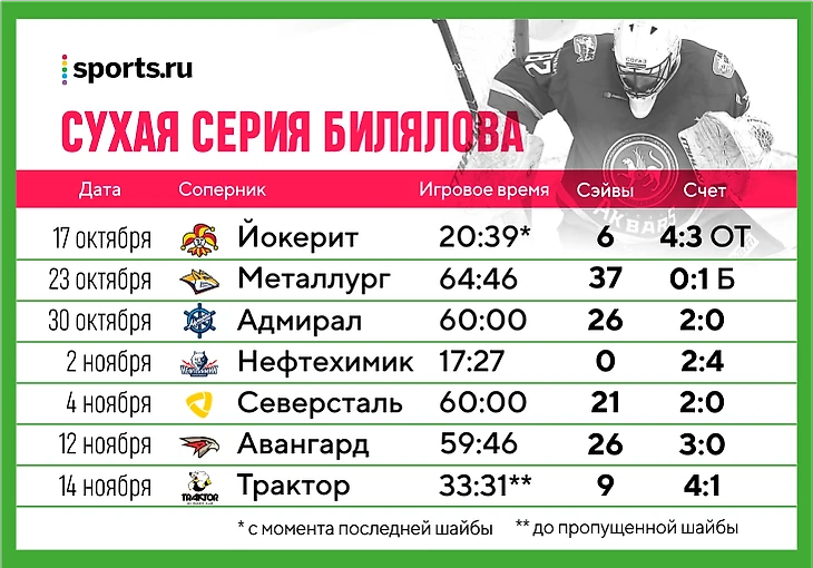 Отметим, что Билялов выходил не в каждом матче «Ак Барса» – тренеры чередовали его с Рейдеборном. Но сушить игры, когда ты появляешься на льду раз в неделю, еще сложнее. По поводу легитимности рекорда не может быть вопросов: среди соперников Билялова была «Магнитка», выдавший сумасшедшую победную серию «Нефтехимик» и даже «Авангард».