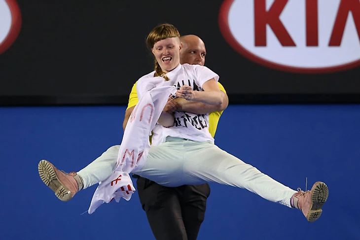 Есть, впрочем, ребята, которым для самовыражения не обязательно раздеваться. Например, финал Australian Open-2015 пришлось ненадолго прервать из-за выбежавших на корт активистов с баннером «Австралия открыта для беженцев».