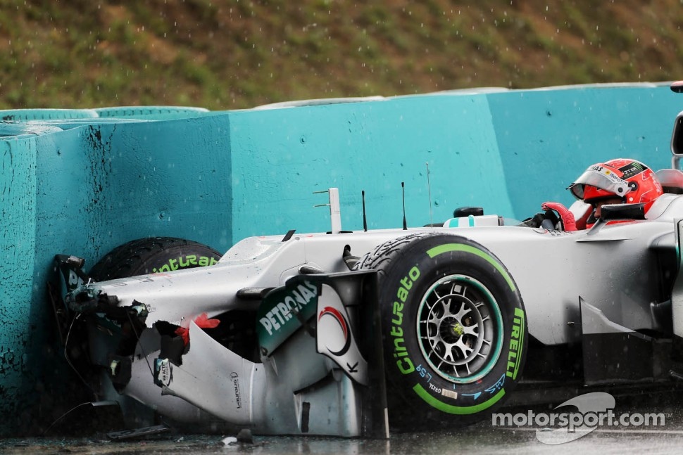 Перейдем к непосредственным событиям уик-энда, воспользовавшись некогда первым номером все той же «Феррари». Заслуженный пенсионер «Ф-1» уже второй гран-при становится едва ли не главным ньюсмейкером пелотона, творя откровенный беспредел. Начинается все по шаблону, Михаэль в одной из практик разбирает о мокрые отбойники переставший ехать «Мерседес», точно забыв, что он не в «Уильямсе», то есть крушить машины вовсе необязательно.