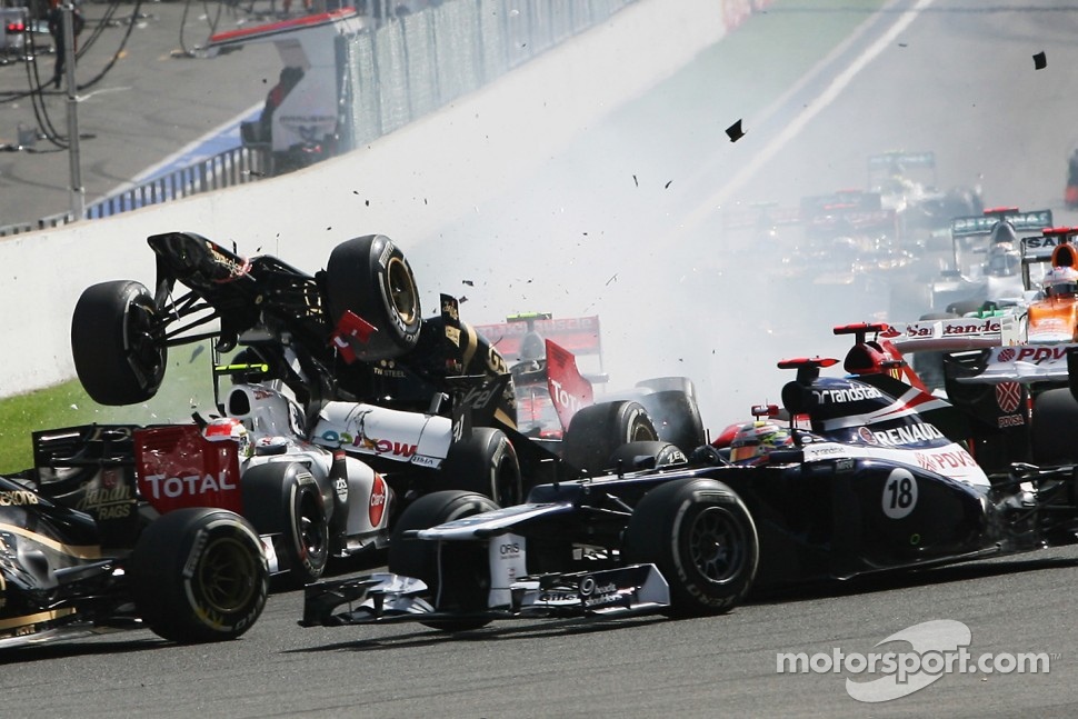 Грожан получил свободное пространство, благодаря уехавшему раньше всех фонарей Мальдонадо, и то ли количество возможных вариантов старта натворило бед в позитивной голове, то ли инженер опять дюже сильно орал по радио, так или иначе, Ромен рванул с места по диагонали вправо, где тихо-мирно ехал недавний бунтарь Хэмилтон, явно не горящий желанием устраивать серьезный дебош. Недофранцуз, не спрашивая разрешения, подцепил задним правым колесом переднее, соответственно, левое Хэма и смертоносный паровозик рванул в сторону первого поворота, где не подозревающие подобной ситуевины пилоты соображали, какого фига впереди делает Мальдонадо. Первым под ГрожаХэмилтона попал Перес, послуживший для недоповара трамплином с которого Ромен сиганул прямиком на «Феррари» лидера чемпионата, в которую следом прискользил неуправляемый «Макларен» Хэмилтона. Досталось и Кобаяси, прятавшемуся левее всей этой истории, и Пастору, который вроде бы уже сумел выскользнуть из поворота, но человек-трамплин Перес венесуэльца не отпустил, буквально прихватив за хвост, дескать, а ну-ка постой, куда собрался?..