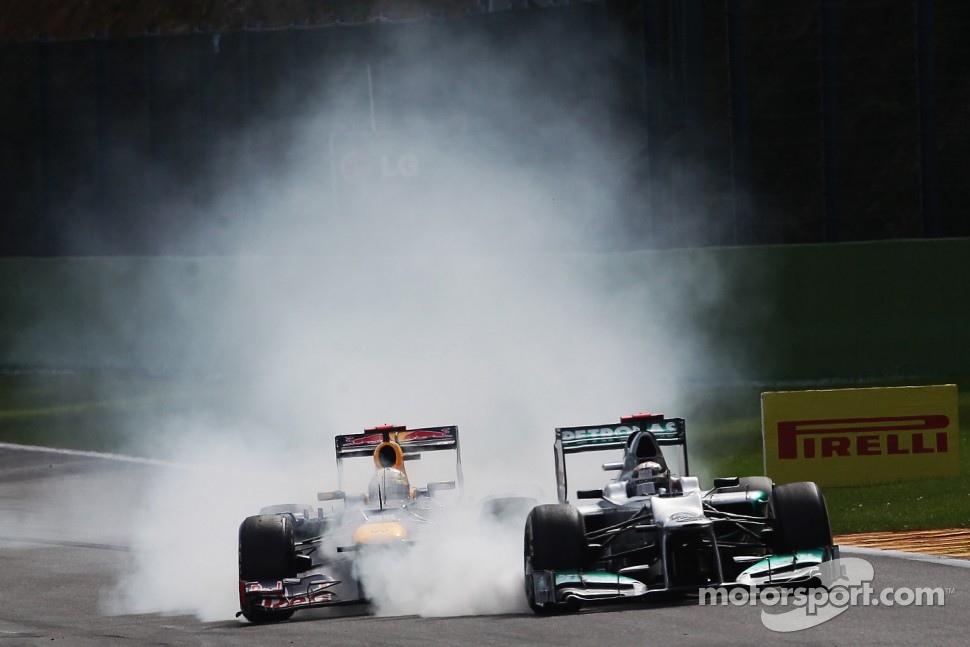 На девятнадцатом круге, а вернее в его финале вошедший в раж Сэб набросился на Шумахера, точно тот ему должен денег, причем много и давно. Оба знатно перетормозили, и Михаэль в облаках карбоновой пыли дабы сберечь нервы и здоровье смотался в боксы, пересекая траекторию Феттеля и едва не забрав «Ред Булл» с собой.