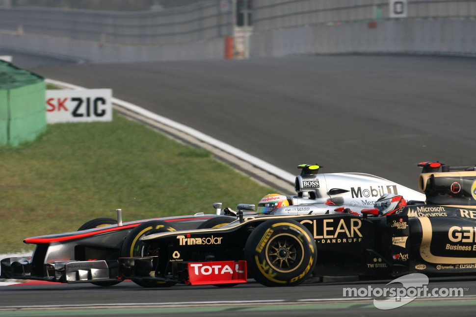 30-й круг напомнил о том, что на трассе есть еще одна весьма веселая парочка – Грожан/Хюлькенберг. Ромен, проиграв позицию на старте, продолжал крутить рулем позади, то и дело пытаясь проскользить вперед на торможениях, но Нико удачно крылся, рискуя навлечь на себя гнев самого проблемного стартера «Ф-1». Недотепыш отрулил на стоп чуть раньше и сумел-таки пройти неуступчивого немца, после того как Хюльки в свою очередь вернулся на трассу из боксов. Но это была только завязка самого красивого эпизода гонки.