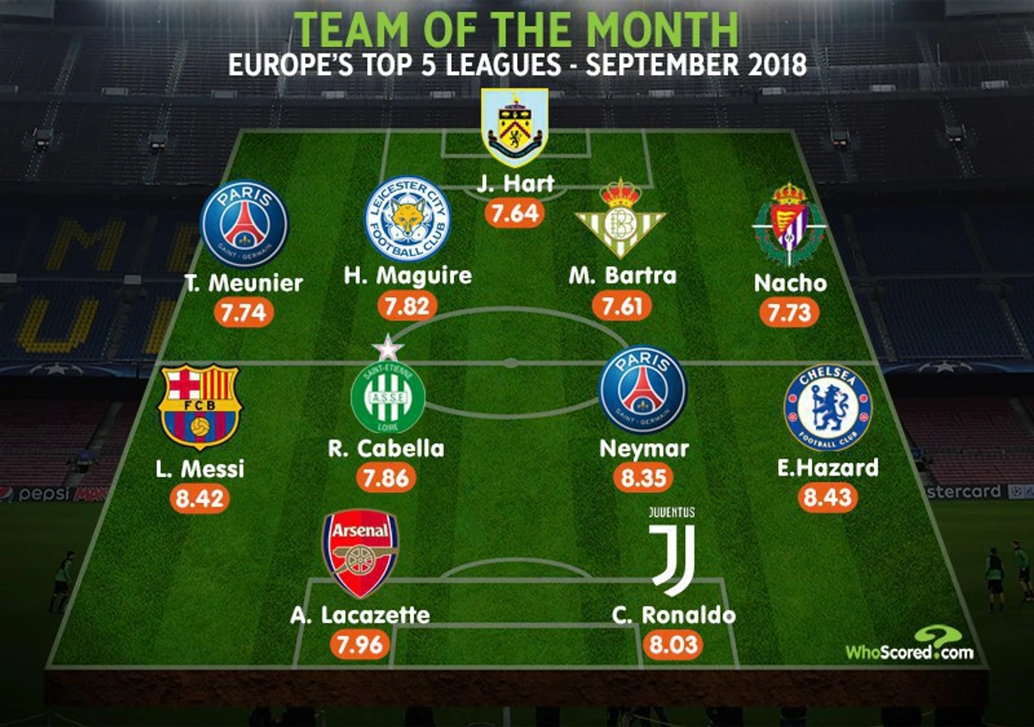 Эден Азар, Александр Ляказетт и Харри Магуайр из Лестера вошли в команду месяца, состоящую из топ-5 лиг Европы.