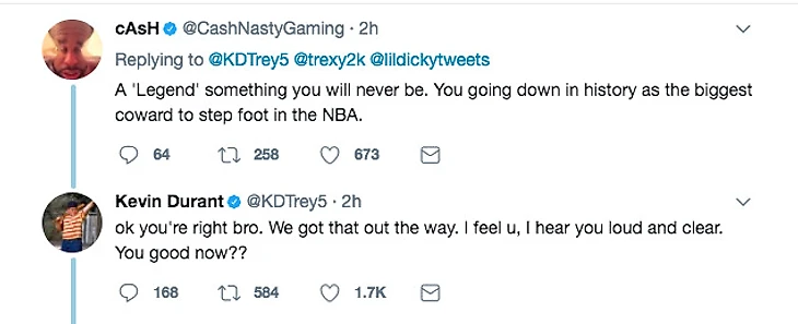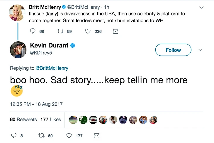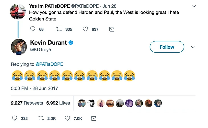 «С ума сойти, у Дюрэнта есть миллионы, но он по-прежнему переживает из-за того, что пишут ему в твиттере», – написал пользователь Тайлер Джексон.