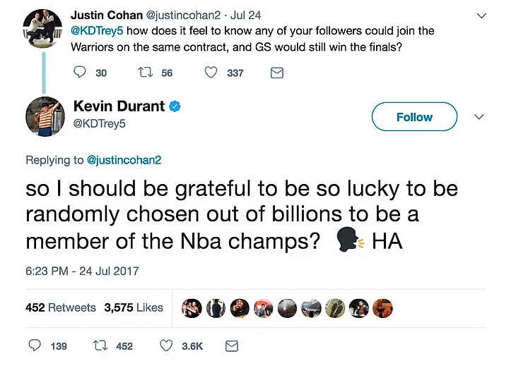 «Кевин, я отношусь к тебе с огромным уважением, но назови хотя бы одну существенную причину перехода в «Уорриорз», кроме желания выиграть чемпионат», – написал в твиттере юзер Коул Кэшвелл.