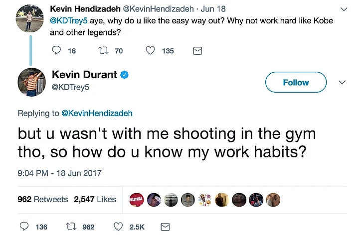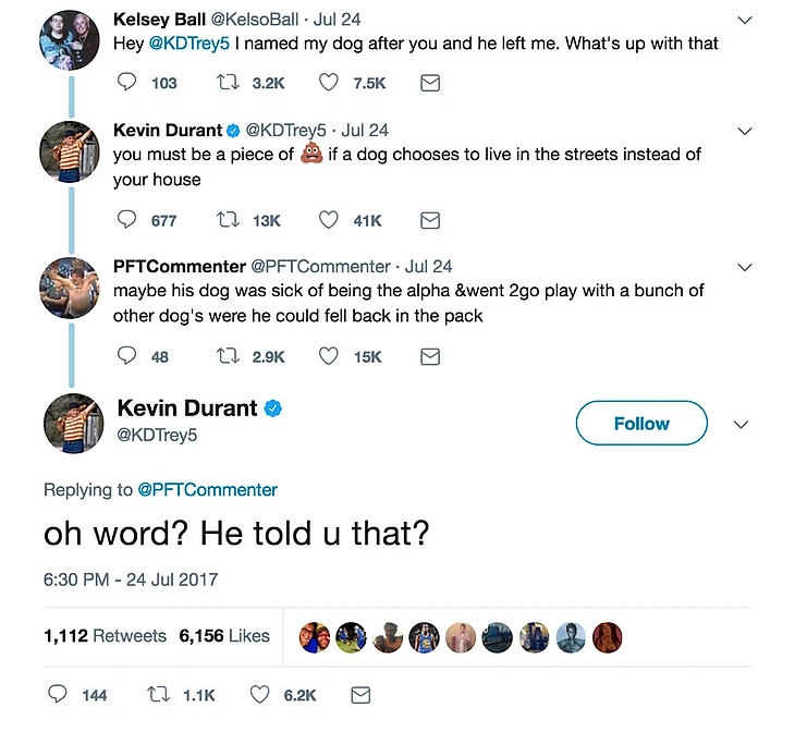 Под этим аккаунтом Кевин Дюрэнт также участвовал в разборках с пользователями, критиковавшими действия Кевина Дюрэнта, и упоминал Кевина Дюрэнта в третьем лице.
