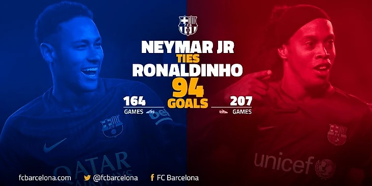 Забив в матче с «Эйбаром» свой 94-й гол за «Барселону», Неймар сравнялся по этому показателю со своим легендарным соотечественником