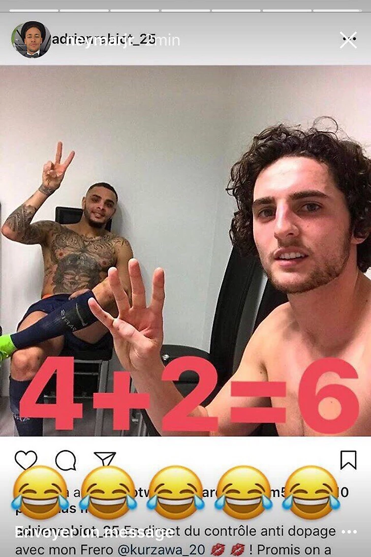 На фото раздевалка "Пари Сен-Жермен" после первого матча. Адриен Рабьо показывает количество забитых "Барселоне" голов, а Левен Курзава демонстрирует жест победителей.