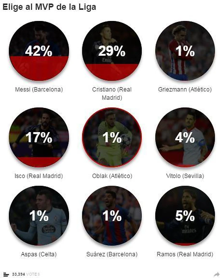 Издание Marca попросило своих читателей определить MVP сезона в чемпионате Испании и 29-летний аргентинец уверенно занял первое место. Месси набрал 42% голосов в опросе, значительно опередив Криштиану Роналду (29%), который с "Реалом" стал чемпионом. Третьим финишировал Иско — 17% голосов.