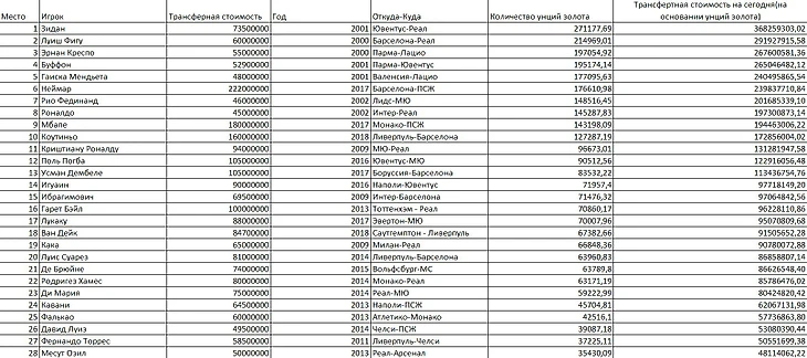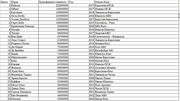 Исходная таблица самых дорогих трансферов с 2000 года: