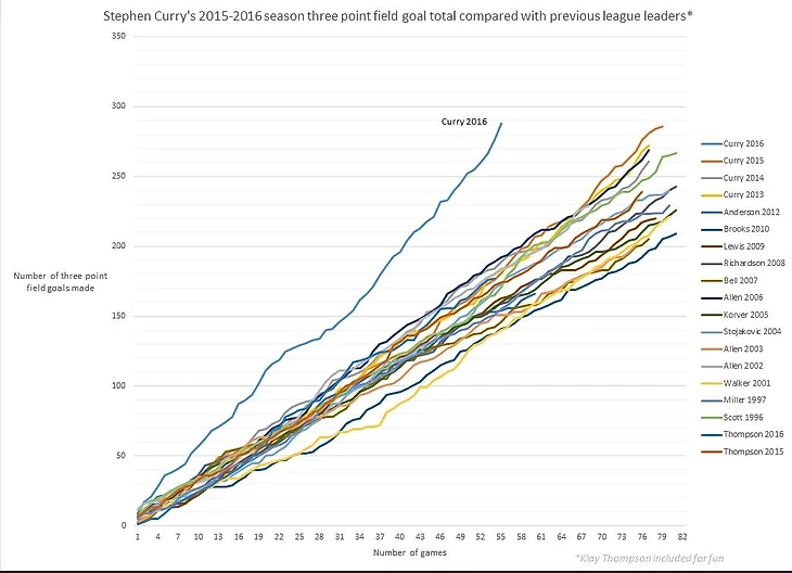 А вот, например, как продуктивность Карри соотносится с результатами Кайла Корвера, чей рекорд (127 матчей с забитым трехочковым) он побил на прошлой неделе.