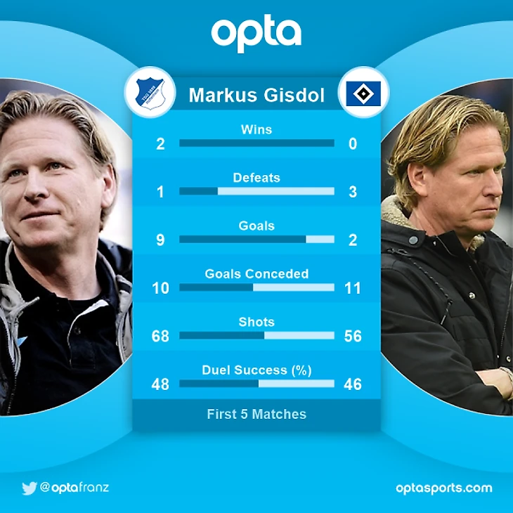 Маркус Гиздоль сейчас имеет 1 очко после 5 матчей с «Гамбургом». Его последний матч в качестве тренера «Хоффенхайма» был как раз против «Гамбурга».