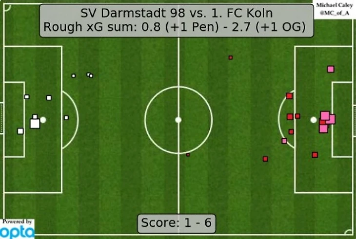 «Кельн» одержал самую крупную победу за 27 лет – в матче с «Дармштадтом» было забито 7 голов, и 6 из них на счету гостей. Свое избиение «лилии» начали сами – первый гол матча стал автоголом: Зулу на 32-й минуте отправил мяч в свои ворота. На 36-й положение хозяев ухудшил Юя Осако, а за три минуты до перерыва Антони Модест сделал счет разгромным. После перерыва в пользу «Дармштадта» был назначен пенальти, и новичок клуба Сидни Сэм его реализовал, но всего через несколько минут «Кельн» снова увеличил разрыв в счете – дубль Юи Осако. Далее у «козлов» сыграли замены – на 85-й забил Йойич, на 89-й – Руднев.