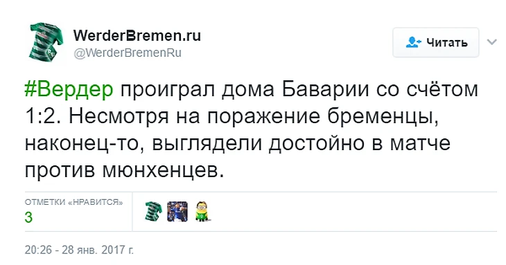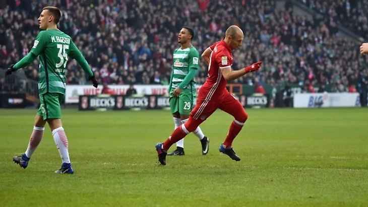 У болельщиков «Вердера» осталось мало приятных воспоминаний о выезде в Мюнхен на первый матч этого розыгрыша Бундеслиги – тогда «музыканты» были уничтожены, и разница между командами была настолько огромна, что не верилось, будто они вообще из одной лиги. В домашней встрече бременцам взять очков не удалось, но по сравнению с матчем первого круга, прогресс значительный. У хозяев были шансы повести в счете в начале матча, но Гарсия пробил в воздух, а удар Гнабри не стал сложным для Нойера. На 30-й минуте «Бавария» вышла вперед после совместных действий «Роббери» – Франк Рибери отдал передачу, а Арьен Роббен отправил мяч в цель. Перед самым перерывом Давид Алаба удвоил преимущество, пробив со штрафного. Мяч после удара австрийца срикошетил от штангии не оставил шансов вратарю. Однако, мюнхенцам не удалось сохранить ворота в неприкосновенности – на 53-й минуте Макс Крузе порадовал переполненный «Везерштадион» точным ударом под перекладину. В остальное же время атаке бременцев не хватало точности, и мечтам о том, чтобы сравнять счет, сбыться было не суждено.
