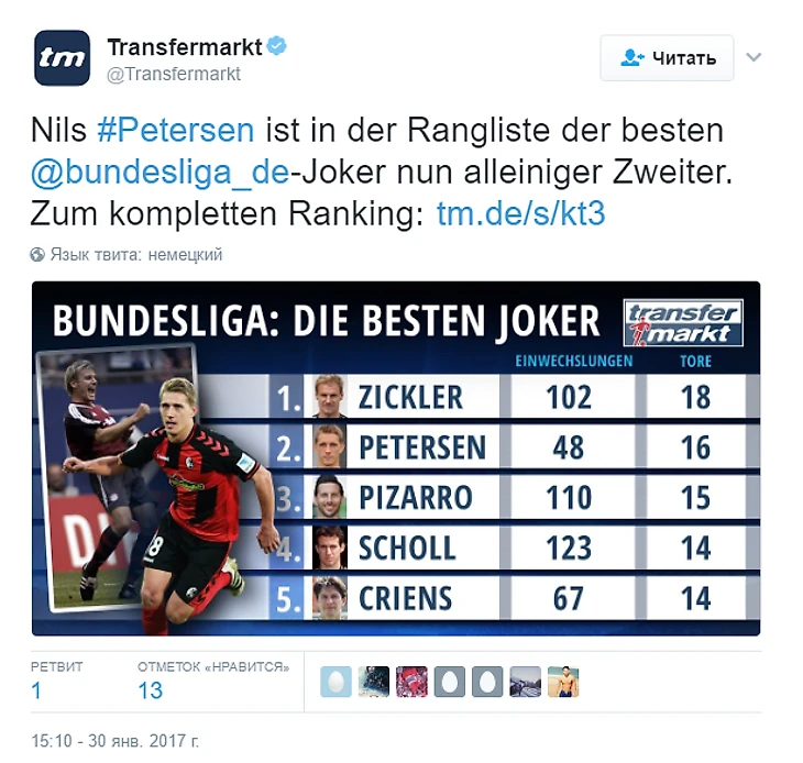 Нильс Петерсен в 16-й раз забил в Бундеслиге, выйдя на замену – это лучший показатель среди всех действующих игроков чемпионата. А в целом лучшим джокером Германии был лишь Александр Циклер (18 голов).