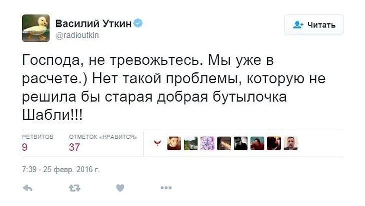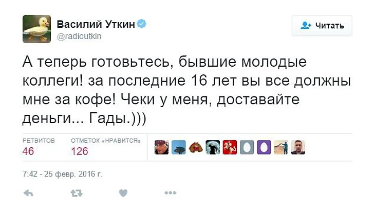 «И только один момент действительно интересен – это то, как они ненавидят Уткина. Ненавидят и не видят, что ли, не понимают, не чувствуют, почему же за него цепляются все эти зрители. И даже те работники редакции, которые, мягко говоря, не были Васиными поклонниками, почему-то его ретвитят. И почему Вася проработал 23 года в одной и той же редакции с одними и теми же людьми, вообще, не поддается пониманию. Он же странный, вредный, oversized, пьет вино, мучается какими-то болезнями, говорит в эфире, что хочет, или, вообще, молчит. Брррррр...»