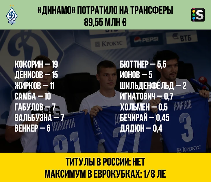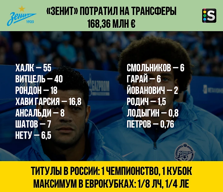В сентябре-2012 случился самый большой и самый импульсивный трансфер в истории русского футбола – за один вечер «Зенит» потратил почти 100 млн евро на двух футболистов. Халк (трансферная стоимость – 55-60 млн евро) и Аксель Витцель (40 млн) отправлялись из Португалии в Петербург, чтобы выигрывать трофеи для босса «Газпрома» Алексея Миллера. Был ли это успешный трансфер? Sports.ru посчитал, сколько клубы премьер-лиги потратили на трансферы за последние четыре года и чего за это время добились.