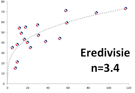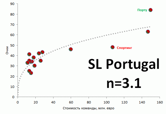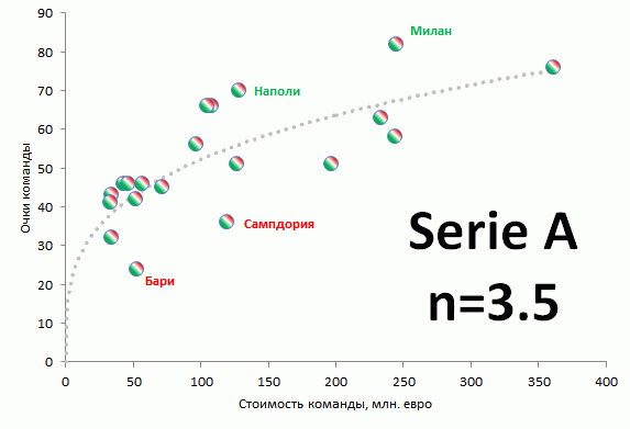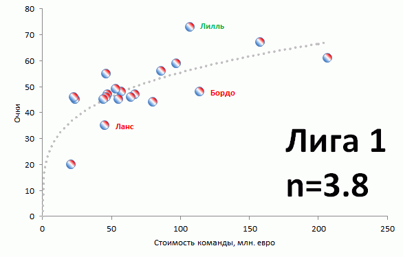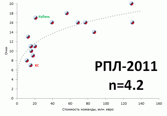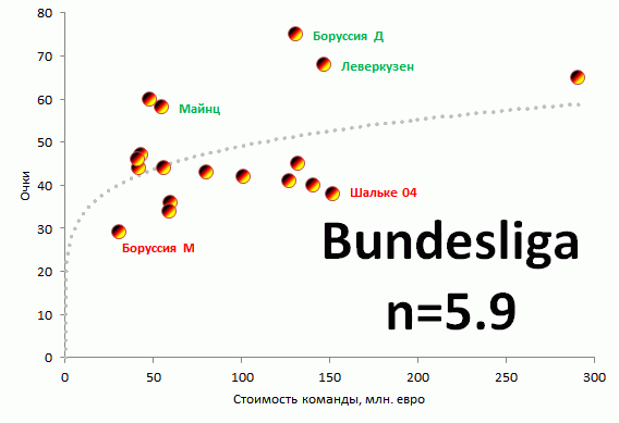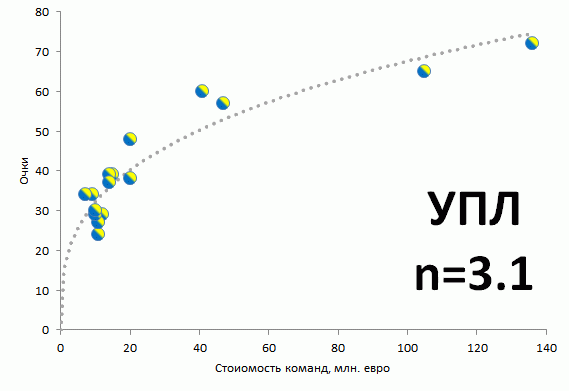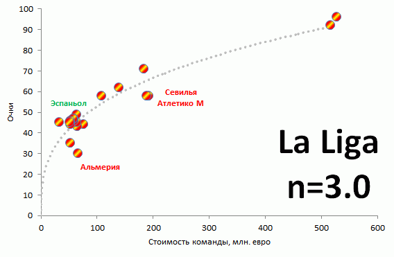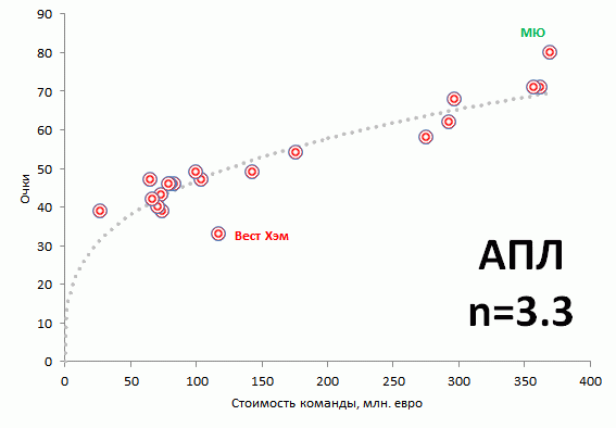На рисунке кружками обозначены позиции команд по итогам чемпионата, а серым пунктиром — график подходящей теоретической функции. Исходя из соображения, что команда стоимостью ноль евро наберёт ноль очков, опытным путём выведена формула связи набранных очков со стоимостью команды: